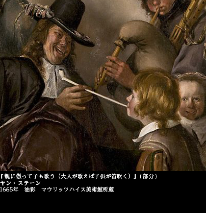 『親に倣って子も歌う(大人が歌えば子供が笛吹く)』(1665年 マウリッツハイス美術館)も、同工異曲の作品で、雑駁なエネルギーが横溢している。