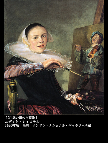 『21歳の頃の自画像』(1630年頃 ロンドン・ナショナル・ギャラリー)という絵では、バイオリンを弾く男を描く画布を前にした画家自身の姿が描かれている。バイオリン弾きの男は、高笑いにしどけなく表情を緩ませるが、その男を描く女流画家は、口元を少し開けて、品のよい微笑みを浮かべている。笑いと微笑みがこだまを交わし合うようだ。