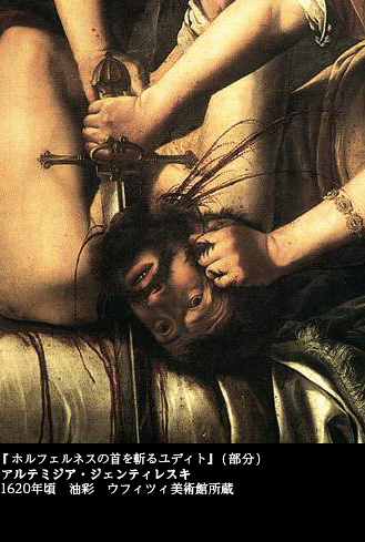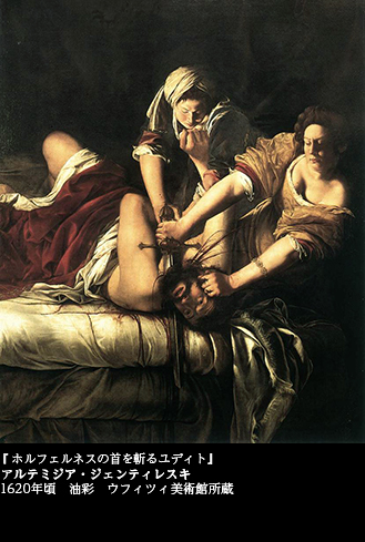 「男成敗」の絵画として、エリザベッタ・シラーニと並んで、つとに世に知られた女性画家の作品がある。アルテミジア・ジェンティレスキ(1593~1652)が描いた『ホルフェルネスの首を斬るユディト』(1620年頃 ウフィツィ美術館)――。