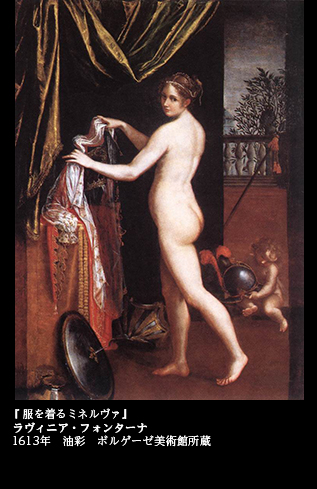 『服を着るミネルヴァ』(1613 ボルゲーゼ美術館)は、そうしたラヴィニアによる女性ヌードの代表格。ミネルヴァはローマ神話における軍神だが、なるほど、裸体の女性の足元には武具が置かれているものの、それを除けば、美しい女性の裸身像に他ならない。斜め後ろを振り向いた彼女の表情も印象的で、流し目が魅惑的だ。