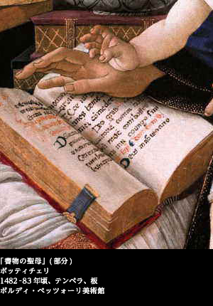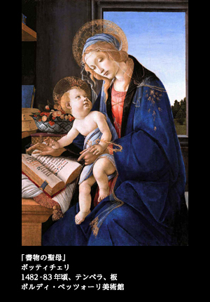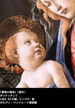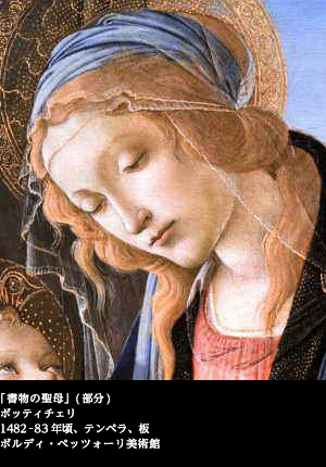 ボッティチェリという画家は、本質的にはやはりヴィーナスやフローラなど、華麗な春の花を思わせる美神像に卓越した才を発揮する画家だと思う。その彼の特質は、聖母を描くにも生き生きと発揮されている。宗教画として許されるぎりぎりのところまで華やぎに装い、神聖にして艶やかな独自の女性美を創出しているのだ。