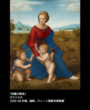 「牧場(草原)の聖母」――。構図、色彩はもとより、人物の姿、表情など、どのように見ても、瑕瑾のない実に美しい絵である。背景の風景やところどころに配された草や花も含めて、すべてが調和と均整の中にあり、その完璧さに唸らされる。