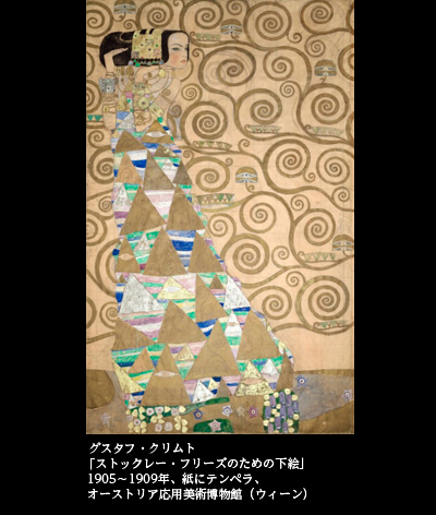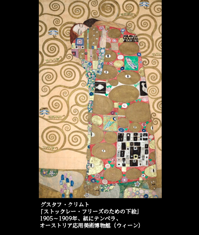 ファム・ファタル的な女性像、そして男女の抱擁などと響き合って、生命の木は豊穣を謳歌する。クリムトの宇宙観の極みとでも言おうか、フリーズの大画面いっぱいにひろがる渦巻き模様など、クリムト流「曼陀羅」の出来ばえだ。
