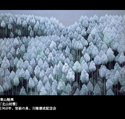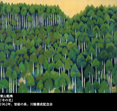 「冬の花」にはまた、双子のような別バージョンの絵がある。「北山初雪」(1968)――。雪をかぶった北山杉の森だが、構図は「冬の花」とほぼ同じである。実はこの作品、ノーベル文学賞を受賞した川端に贈られた絵であった。