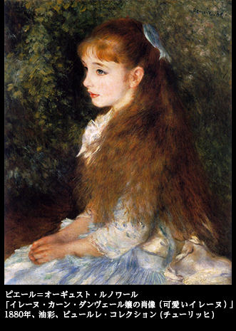 少女画の中でも、美少女決定版をあげるとすれば、ルノワールの「イレーヌ・カーン・ダンヴェール嬢の肖像(可愛いイレーヌ)」(1880)にとどめを刺すことになるだろう。過去にも来日したことがあり、2018年にも再び来日が決定しているのだが、その謳い文句に曰く、「絵画史上、最強の美少女(センター)」――。絵画展(「至上の印象派展 ビュールレ・コレクション」)のポスターにも、このキャッチコピーとともに、イレーヌ嬢が堂々の麗姿をさらす。今風を気取ったルビの是非はともかく、美少女最強スターとしてお出ましいただいたことは間違いない。