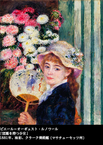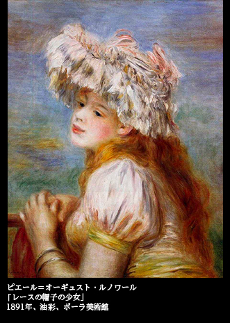 ルノワールといえばピンク色が重ねられた豊満な女性のヌードを思う人も多いかと思うが、少女を描いた作品も少なくない。個人的な趣味から言うと、豊満女性は苦手ながら、少女画には強く惹かれる。「ピアノを弾く少女たち」(1892)については以前に書いたことがあるが、「団扇(うちわ)を持つ少女」(1881)、「レースの帽子の少女」(1891)など、いずれも基本的には、移ろいゆく歳月の中にも移ろいを忘れたかの如く、確かな幸福の時間に生きる少女たちの輝きを描いたものである。