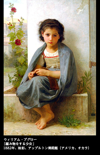 ブグローは好んで、田舎の貧しい少女を描いた。幼いながら、労働の現場に生きる少女もいる。「編み物をする少女」は、私の知るだけでも、1874年、1879年、1882年と繰り返し描かれた。「難しいレッスン」(1884)、「In Penitence(後悔)」(1895)、など、全身像の場合、少女は裸足だ。