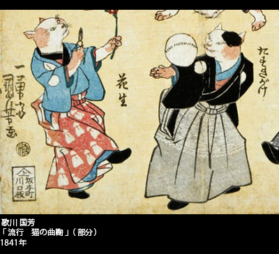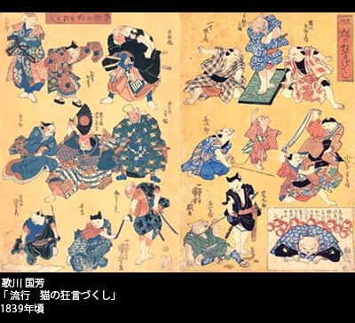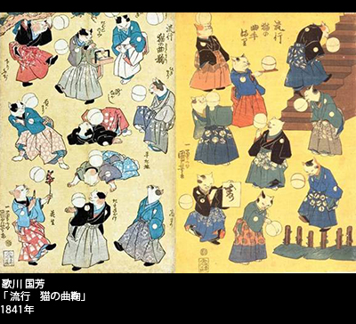 多種多様な猫絵を描いた国芳だったが、ウェインと同じような擬人化した猫たちが活躍する絵も多い。「流行 猫の狂言づくし」は、流行の芝居(歌舞伎)の主役たちの恰好を猫が演じている。見えを切る猫、踊る猫、なかには裃を着て口上を述べる猫もいる。「流行 猫の曲鞠」は、鞠を使った曲芸の数々を猫が演じて見せるというもの。実在した菊川国丸という人気曲芸師の仕業を巧みに猫が真似ている。