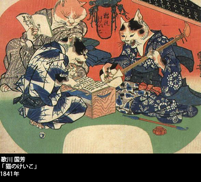 およそ半世紀後に描かれたウェインの猫絵と比較すると、無論、洋服と着物と、洋の東西の差は明白ながら、猫が人間の恰好をして立ち回る、そのおかしみ、愛らしさなどには、いささかも差がないことがわかる。趣向という点では、国芳のほうが仕掛けに富んだ絵が多いように思うが、それは江戸末期という爛熟の時代のゆえであろうか。国芳が65歳で死んだのは1861年だが、驚くことに、明治維新からわずか7年前にすぎない。