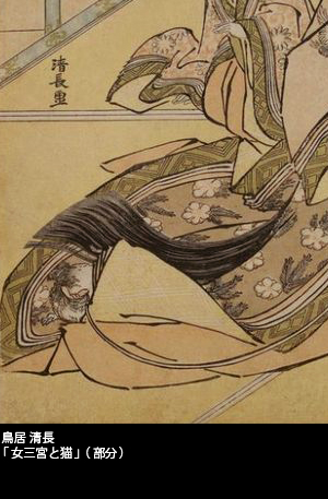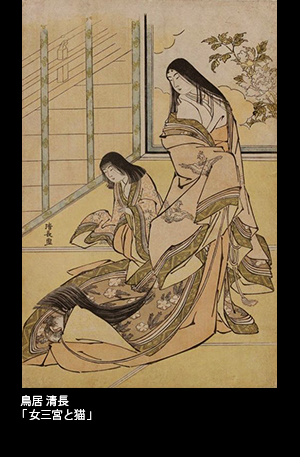すらりとした八頭身の美人画で知られる鳥居清長に、「女三宮と猫」という絵がある。御簾のあがった部屋に佇む王朝の女性――。女性は紐を引いており、その先には着物の裾に隠れるようにうずくまる小さな猫がいる。