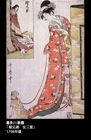 美人画を代表する歌麿にも、「絵兄弟 女三宮」という絵がある。ひとつの画面上で、本歌にあたる猫を引く王朝美人の女三宮を枠囲いの中に収め、メインとしては犬を引いた当世風の遊女を描くという、凝った趣向の作となっている。