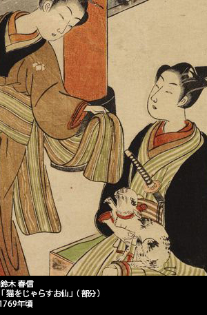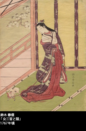 ちろん、鈴木春信の絵には女三宮とは無関係の猫も登場する。その実、江戸の浮世絵師のなかにあって、春信は国芳に次いで多くの猫絵をものした大家なのである。