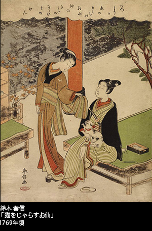 「猫をじゃらすお仙」――。当時、谷中の笠森稲荷の門前にあった茶屋「鍵屋」の看板娘のお仙をモデルに、春信はいくつもの「笠森お仙」の美人画を発表した。これはそのなかでも特に猫と結びついた作品となる。