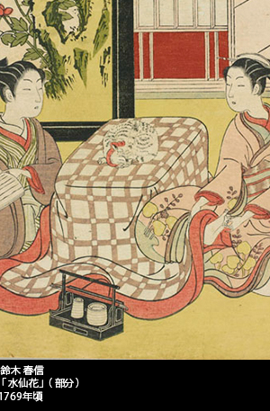 火燵の向こう側に突き出た男の足を、女がくすぐっている。普通、この絵は女からの自発的行為を男が受けるように解釈されることが多いが、私に言わせればそれは一面的な表層の見方で、春信の男女を凝視する眼差しははるかに複層的である。