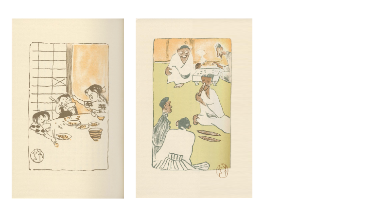 そういうディテールの食い違いを見せつつも、これはいかにも『猫』の物語世界の幕開けを視覚化した素晴らしい絵だ。私がつくづく感心するのは、この人間に虐待される猫の絵を、障子ごしのシルエットで描いた点だ。漱石の文章には、影絵を必要とする要素は登場していない。つまり、これは不折が独自に物語に賦したイメージに他ならない。
