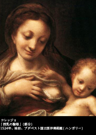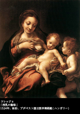 コレッジョの「授乳の聖母」(1524年頃)はそうした動きをとらえた傑作である。幼子イエスは、ただ無表情に聖母の膝に抱かれ、じっと顔を母の胸に埋めるだけの存在ではない。元気のよい男の子であり、愛くるしい赤ん坊そのものである。