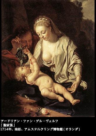 それから約200年の後、バロック後期のオランダの画家、アードリアン・ファン・デル・ヴェルフが描いた「聖家族」(1714)を見てみよう。