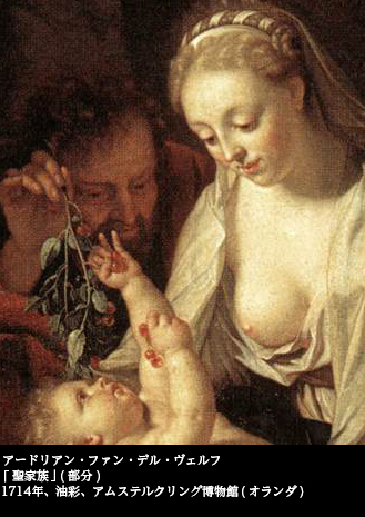 ヴェルフは神話世界を画題に裸体画を多く描いた人で、ここでも、マリアのはだけた胸と乳房の美しさは輝くばかりである。聖家族を描きつつ、聖母は女性としてもこよなく充実し、健やかにしてつつましいエロスを発散してやまないのだ。