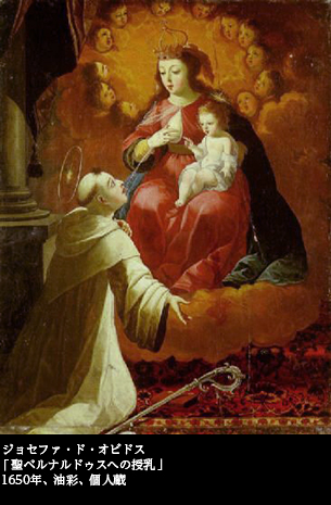 私の知る限り、「聖ベルナルドゥスへの授乳」という絵が2作品あり、どちらも1670年頃に描かれた。これは勿論、カーノと同じく、聖人伝説に依拠したかたちだが、彫像ではない生身の聖母が、右乳を手で揉み、乳をほとばしらせる。白い乳は聖ベルナルドゥスの口元に真っ直ぐに飛んで行く。