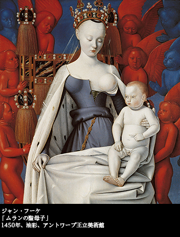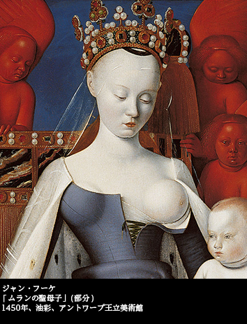 忌に挑むかのように、聖母の乳房が官能性を最大限に発揮した絵がある。時代的には少し戻って、15世紀のフランスで活躍したジャン・フーケの描いた「ムランの聖母子」(1450年頃)がそれである。