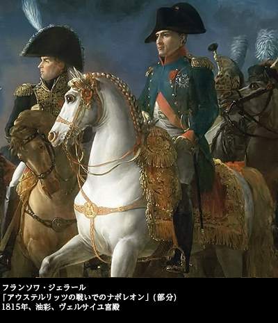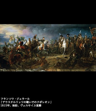 ジェラールの絵は、ナポレオンを中心に戦場の様子を描くが、馬上の皇帝はいたって静かで、英雄的なそぶりを見せるでもなく、それ以上に、画面手前の死者たちの存在が気になってしまう。同じく白馬に跨るナポレオンを描きながら、『ベルナール峠からアルプスを越えるボナパルト』をものしたダヴィッドとの差は明らかである。