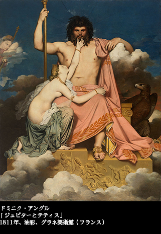 性懲りもなくというか、アングルは、この正面性を特徴とする絵を、後々にも描いている。例えば、イタリアに移って5年後の作になる『ジュピターとテティス』(1811)において、神々の王たるジュピター(ギリシャ神話におけるゼウス)を、堂々の正面性のなかに鎮座させている。「玉座のナポレオン」と相似形をなすスタイルだ。