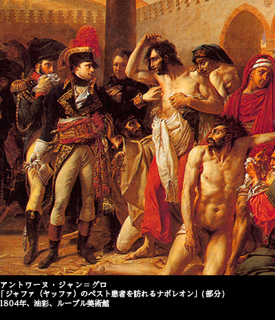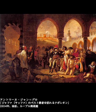 3部作のうちのひとつ、『ジャファ(ヤッファ)のペスト患者を訪れるナポレオン』(1804)は、中東の戦地で伝染病に罹患した兵士らを病院に見舞い、あたかもキリストのように病人に接するナポレオンを描いたもので、宗教画がナポレオンに接ぎ木されたような雰囲気をもつ。
