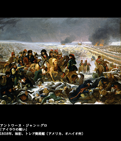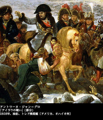 グロはそのような困難と犠牲を一身に背負って祖国フランスに尽くすナポレオンに魅せられているのだろう。こうした戦争画によって、グロは自身の画家としての才能を最大限に発揮し、輝かせることができた。底の浅いプロパガンダとは違うところに、グロのナポレオン絵画は結実していた。