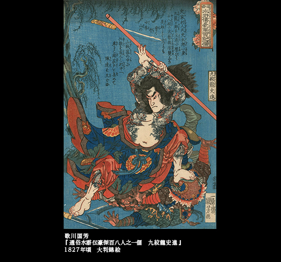 出世作となった武者絵の『通俗水滸伝豪傑百八人之一個』においても、それぞれの豪傑のいさおしの姿が、武勇伝のエッセンスを語りこみつつ、荒ぶる力を爆発させ、けれんに描かれる。