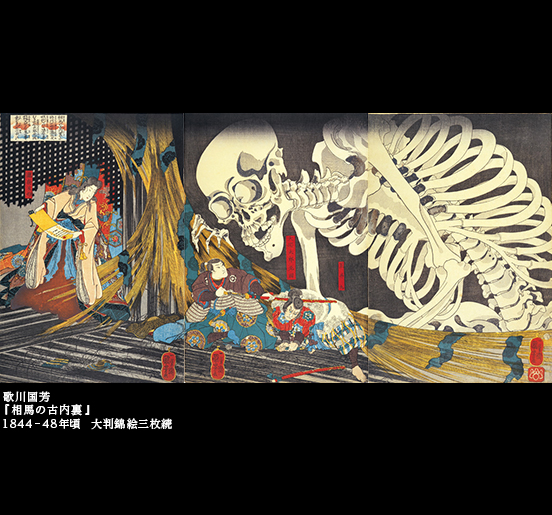 やはり有名な武者絵の『 そう ふる 内裏 だいり 』を見てみよう。山東京伝の 読本 よみほん 善知烏安方忠義伝 うとうやすかたちゅうぎでん 』から想を得た絵で、平将門の遺児で妖術を操る瀧夜叉姫が相馬の古内裏に立て籠もり、謀反を企てるが、大宅太郎光国に破れて自刃する、その対決の場面が描かれた。