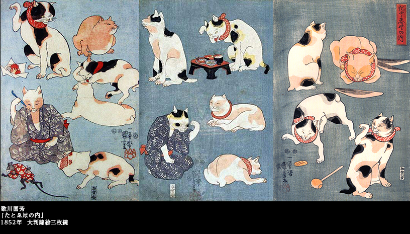 武者絵で名をあげた国芳だったが、21世紀の今では、猫ブームの煽りを受け、猫絵の画家としてのほうが有名になってしまった感がある。実にさまざまな猫の絵を描いたが、美しい傾城(遊女)がペットの猫と戯れるなどはおとなしいほうで、着物を着た猫が人間そっくりの立ち居振る舞いに及ぶのは朝飯前、とにかく猫であれば何でもござれのオン・アンド・オンを華々しく展開した。