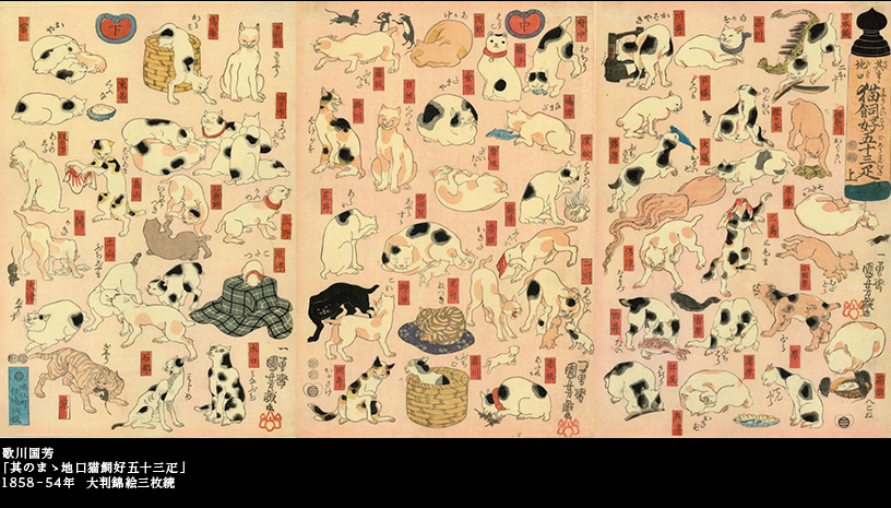 『 のまゝ 地口 じぐち 猫飼好 みょうかいこう 五十三疋 ごじゅうさんびき 』上中下という絵がある。東海道五十三次の宿場名を猫がらみの「地口(語呂合わせ、ダジャレ)」にして、しかるべき猫の絵を添えたもので、53点の猫絵、猫の数にすると子猫も含めて70匹あまりの猫たちが一堂に描かれており、「猫尽くし」の絵として壮観を極める。