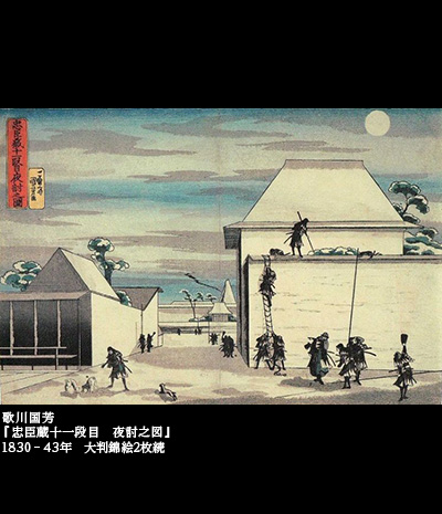 それらの絵を「真の画」らしく感じさせた第一の理由は遠近法であったろうが、実際、国芳は西洋画から学んだ遠近法を使って、絵を描いてもいたのである。今に伝わる『忠臣蔵十一段目 夜討之図』がそれだが、もとは西洋遠近法を駆使して忠臣蔵シリーズを出す計画だったらしい。