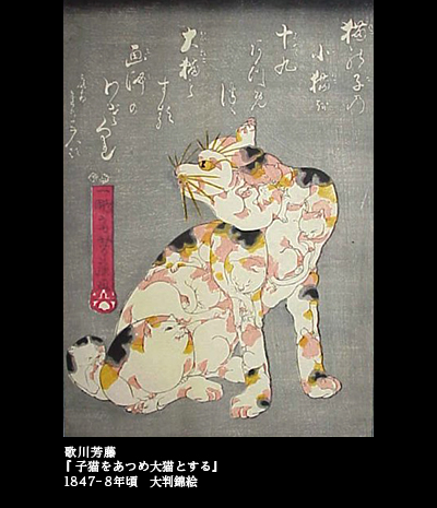国芳の弟子・芳藤には、『子猫をあつめ大猫とする』という19匹の猫を寄せ集めて1匹の三毛猫を描いた作品がある。国芳が人の顔でやったことを、猫で応用した格好だ。1847、8年頃の作品というから、国芳もまだ50歳ほど、脂ののった時期である。国芳は弟子にも猫絵を描くよう指導したというから、この絵なども、国芳のお声がかりで仕上げることになった可能性が高いのではなかろうか――。