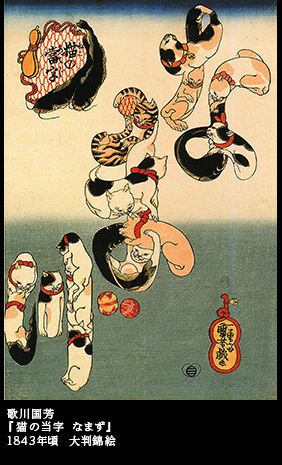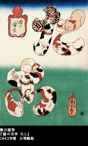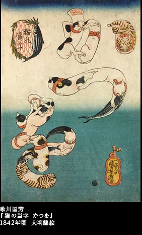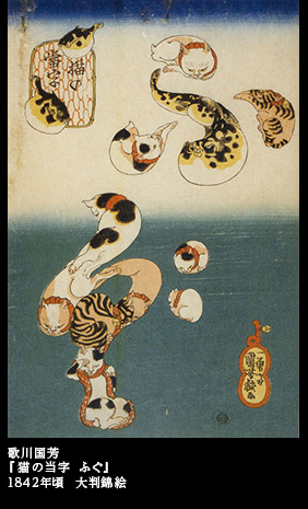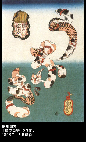 『猫の当字』というシリーズ画がある。猫たちを集めて、仮名文字にしてしまった。「うなぎ」「たこ」「かつを」「なまず」「ふぐ」と、全部で5点が知られている。
