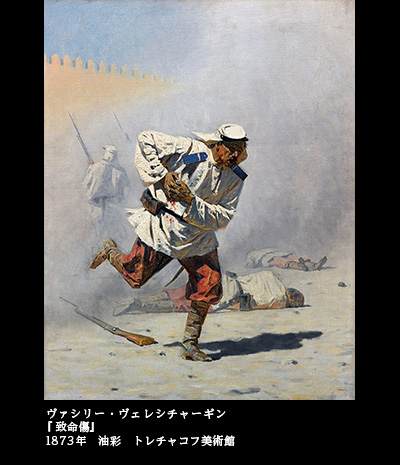 『戦争の結末』は『トルキスタン・シリーズ』と呼ばれる作品群に含まれる。1868年、ロシア軍のトルキスタン遠征に従軍し、その体験から生まれたシリーズだが、そのなかの1点、『致命傷』(1873)という絵も、戦争の真実を伝えるドキュメンタリータッチの作品だ。