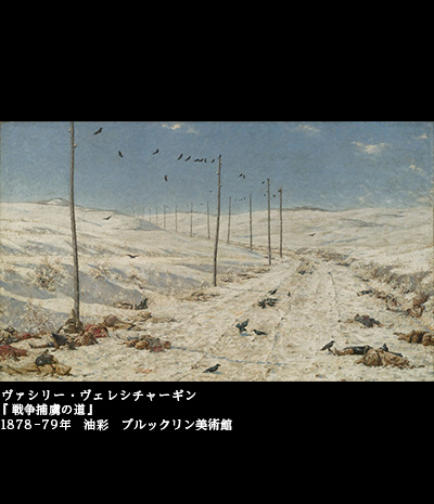 ヴェレシチャーギンの絵に出会うことがなかったならば、生まれようもなかった歌曲だった。回顧展の会場では、ロシアのバス歌手が朗々と歌う哀しみの歌が流されている。
