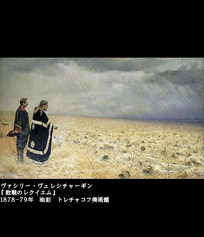 ヴェレシチャーギンの代名詞のようにもなった作品が、画家としての比較的早い時期に描かれているのである。「戦争画家」はヴェレシチャーギンにとって、画家としての出発点であり、帰結点でもあった。1904年、画家は日露戦争に従軍して亡くなっているのだ。