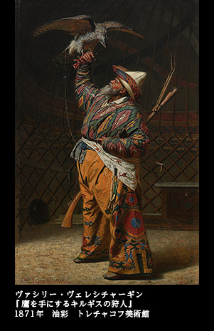 『鷹を手にするキルギスの狩人』(1871)という、堂々たる老鷹匠を描いた作品が目を引く。精悍な顔つき、押し出しの強さ、鷹と人との一体感など、威厳に満ちた老狩人の姿を、共感とともに描き出している。エキゾティックな袴風の衣裳の描写も見事だ。