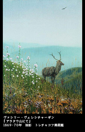 アラタウは、中央アジアのカザフスタン、キルギス、ウズベキスタンにまたがる山脈で、ヴェレシチャーギンの絵も、山また山がつらなる深山を背景に、一頭の鹿がたたずむ様子を描いている。