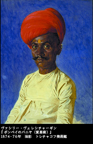 ヴェレシチャーギンは、ターバンを載せた男の絵を多く描いた。中央アジアでも、インド周辺でも、オリエント風俗の象徴とでも言うように、画面にはターバンの男たちが登場した。