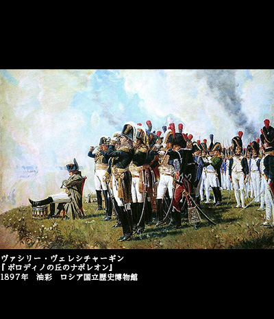 『ボロディノの丘のナポレオン』は、今から攻め落とさんとするモスクワの町を、崖の上に置いた椅子に腰かけて眺めるナポレオンを中心に描く。多くのお付きの将校たちが背後に立ち並ぶが、いずれも華やかに着飾ってはいても、どこかまとまりがない。何人もが望遠鏡で戦況を確かめているが各自各様であり、後列に下がれば、勝手なおしゃべりに興じる者たちもいる。