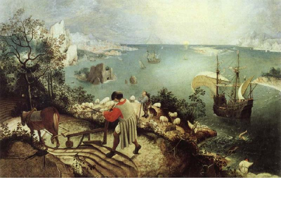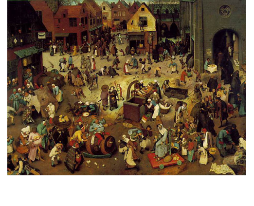リューゲルには、もっとあからさまにメッセージ性を全面に押し出した絵もある。かの「バベルの塔」は言うに及ばず、処刑の場のすぐ近くで踊り興じる人たちがいる「絞首台の上のカササギ」や、繁栄する港湾都市にあって、はしばみの実を与えられる代わりに鎖でつながれてしまった「2匹の猿」など、絵に込められた批判や風刺の毒は一目瞭然である。寓意をなぞった絵も多い。ウィーンの「謝肉祭と四旬節の喧嘩」もそうだが、寓意を描くのに、イメージの限りを尽くして画面いっぱいに横溢させた作品も、いかにもブリューゲルである。寓意はしばしばイマジネーションの翼を得て、幻想画の赴きさえも生じる。