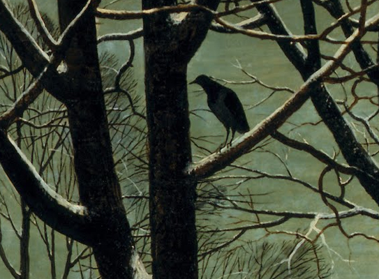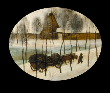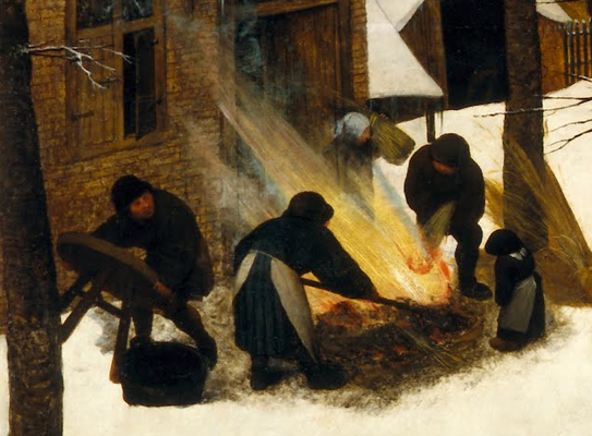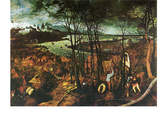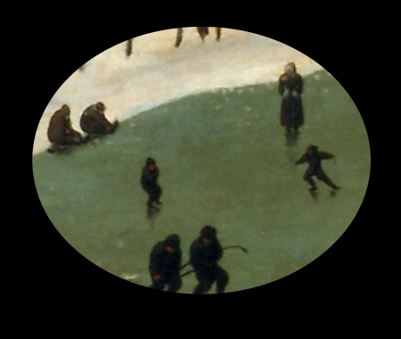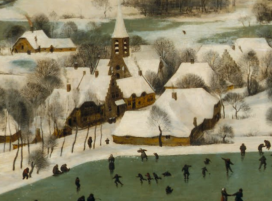 遠くにも働く人が見える。だが、遠景ではそれ以上に、氷結した池の上で遊び興じる人たちの姿が目立つ。息も凍るような厳寒の中、人の営みは確かに続いているのだ。ただ、ブリューゲルの描き方は、どこか影法師でも見るように、郷愁の中に息をひそめる。圧倒的な冬の支配下に、人は何とか命をつなぐばかりなのである。あたかも、冬の木々が葉を落とし裸木となっても、その内部に命をたくわえ、春の芽吹きをじっと待つかのように…。
