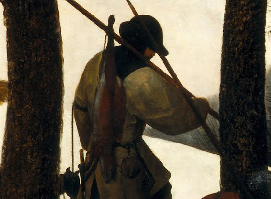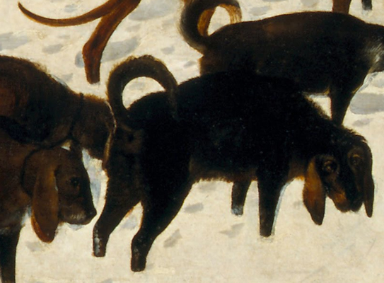 言うまでもなく、それは冬の風景を描いた絵である。一見すると、世界はすべて雪と氷に覆われ、何もかもが凍てついてしまったような気にさせられる。だが、そこでも人の暮らしは続いている。狩人たちは犬を率いて雪の野を行く。ただ、獲物を狙って意気揚々と出猟するようには見えず、狩りに出ては見たものの、空しく家路を引き返す徒労感の滲む後ろ姿のように感じる。旅籠であろうか、看板のかかる家屋の前でも、火を焚きながら野外での仕事が続いている。寒さに堪えつつ、生きるがための労働である。