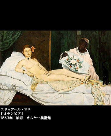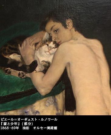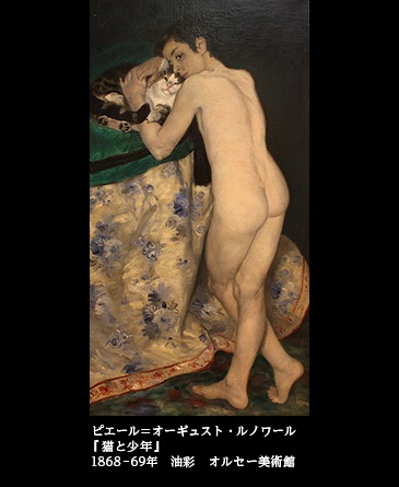 娼館のベッドで裸身のまま横たわっていた女性は、立ち姿の裸の少年に変えられ、女性の足元にいた尾を立てる黒猫は、少年が抱きしめるやさしげな縞猫に変わった。黒人メイドまで登場させて赤裸々に社会的偽善を暴露させたマネに比べ、ルノワールの筆致は穏やかで優美、そして実は、先輩画家に比べてはるかにエロティックだ。