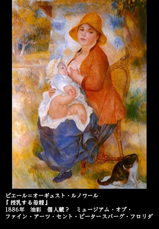 1886年に描かれた『授乳する母親』(個人蔵? ミュージアム・オブ・ファイン・アーツ・セント・ピータースバーグ・フロリダ)は、前年に長男ピエールを生んだ妻のアリーヌが赤ん坊に授乳する姿を描く。庭を舞台とするこの絵は、アリーヌの故郷・エソワの実家に滞在中、描かれたという。