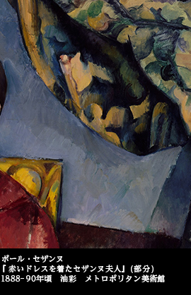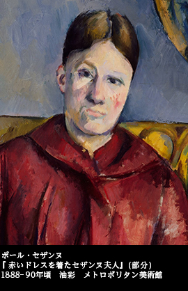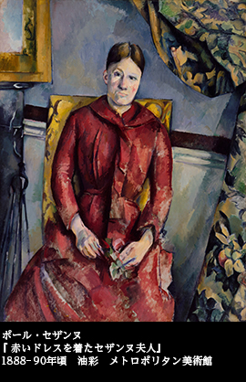 夫婦の共同作業から、どのような作品ができあがったのか、代表的な1点を見てみよう。ニューヨークのメトロポリタン美術館が所蔵する『赤いドレスを着たセザンヌ夫人』(1888~90頃)――。