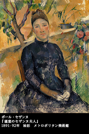 『温室のセザンヌ夫人』(1891~92 メトロポリタン美術館)は、いかにもそのような傑作である。土を思わせる黄土色の背景に、樹木や鉢植え、花などを配し、土色に赤みをさしたような顔色の夫人がこちらを向く。