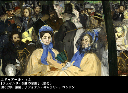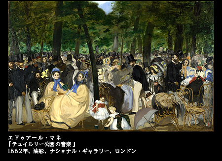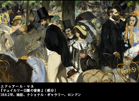 先に『フォリー=ベルジュールのバー』を語って、マネの仕掛ける舞台設定の巧みさについて述べたが、この『テュイルリー公園の音楽』においても、オンとオフを敢えて分離させたマネの劇場的な設定の意匠に、感心せざるをえない。